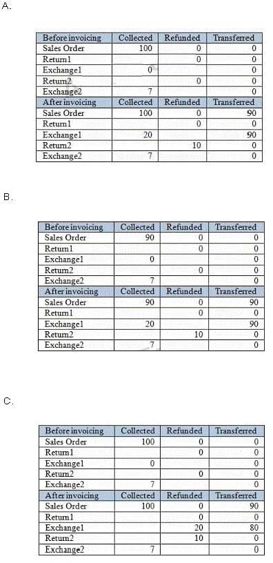 A customer orders two lines, Item1 for $10 and Item2 for $90. The customer soon decides he wanted the updated model instead, and Return1 and Exchange1 were created for Item2 with a value of $110 as a regular exchange.