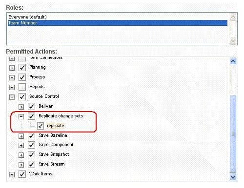 What does the permission indicated below in the Team Configuration of a Project Area Editor allow role members to do? Team Configuration-> Source Control->Replicate change sets- >replicate