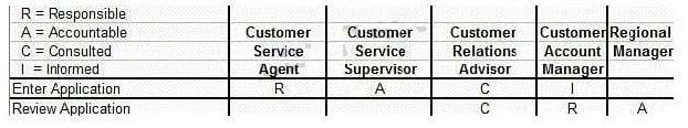 A BPM analyst is modeling the process for acquiring an account. During an interview with the customer service supervisor, the BPM analyst was provided with a Responsible, Accountable, Consulted, Informed (RACI) chart that had been created with the key roles and activities in the process.