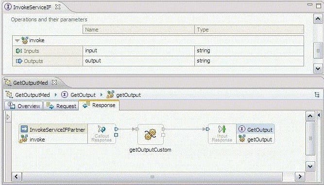 An integration developer needs to get the 'output' value of the operation 'invoke' from within the 'getOutputCustom' primitive of the response flow shown in the exhibit. Which of the following code snippets must be used?