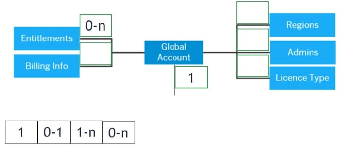 A global account has a relationship with entitlements. The cardinality of this relationship is "0-n" as shown in the graphic.