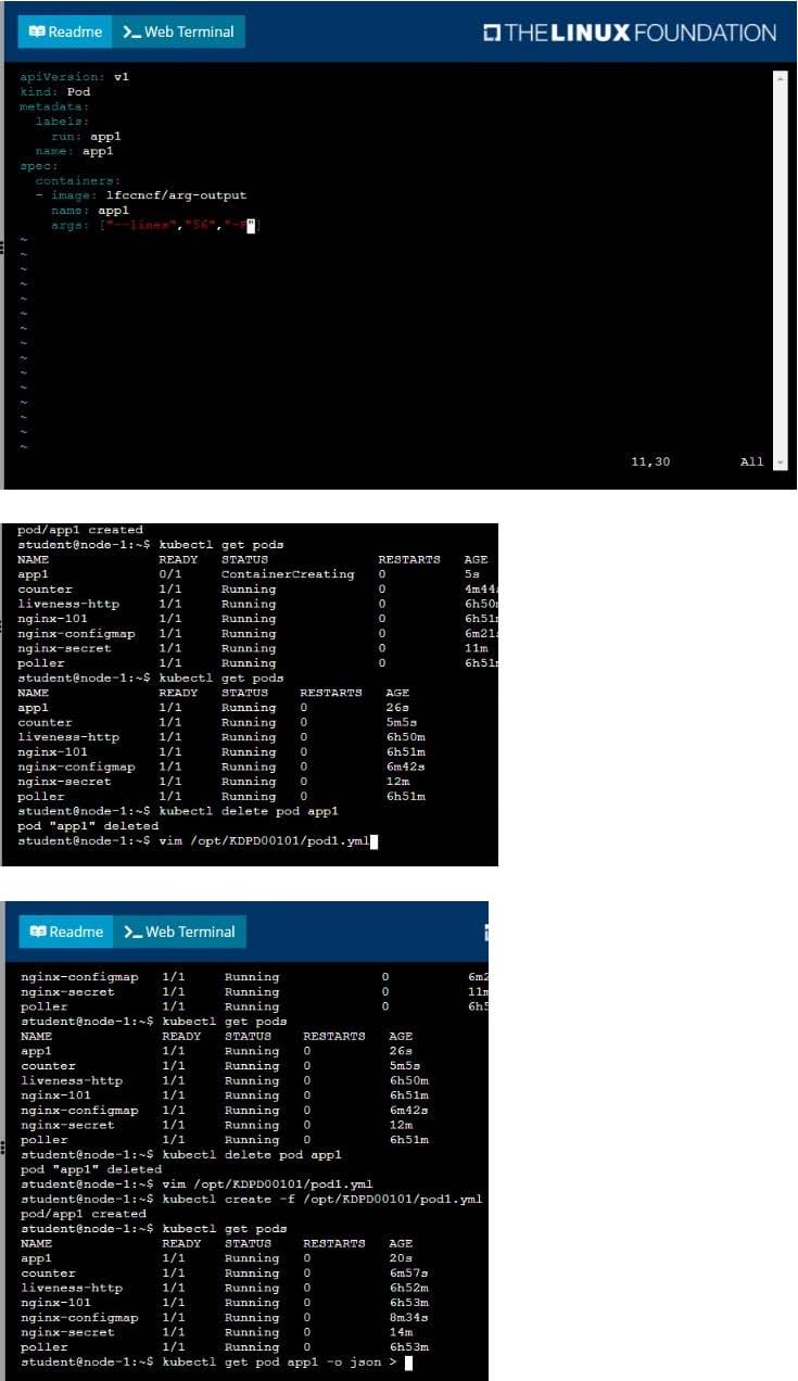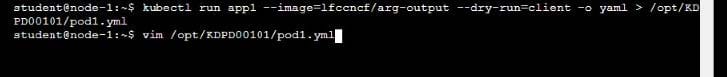 /opt/KDPD00101/podl.yml to create a pod named app1 that runs a container named app1cont using image Ifccncf/arg-output with these command line arguments: -lines 56 -F