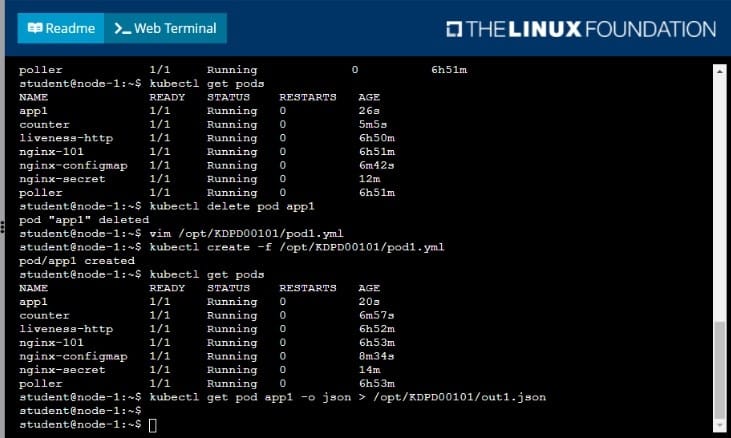 When the pod is running display summary data about the pod in JSON format using the kubect1 command and redirect the output to a file named /opt/KDPD00101/out1.json