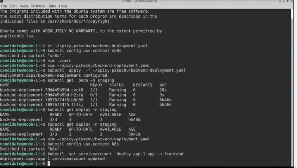 Update the Deployment app-1 in the frontend namespace to use the existing ServiceAccount app.