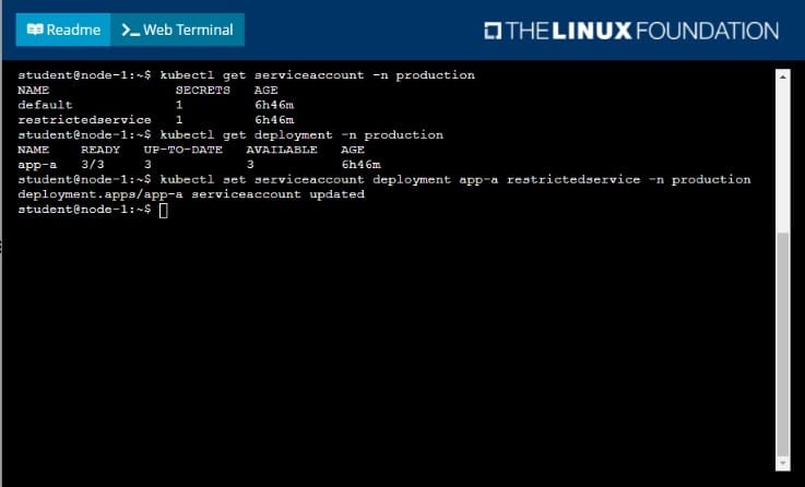 Update the app-a deployment in the production namespace to run as the restrictedservice service account.