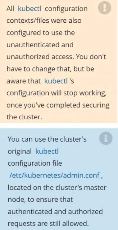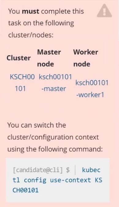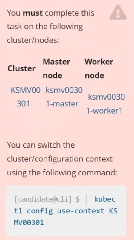Master node: master Worker node: worker1 You can switch the cluster/configuration context using the following command: [desk@cli] $ kubectl config use-context qa-cluster