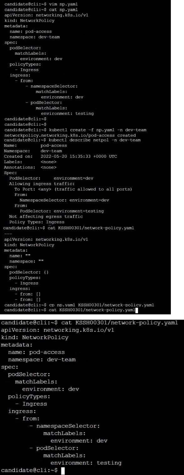 Create a NetworkPolicy named restricted-policy to restrict access to Pod product running in namespace dev.