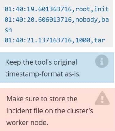 Using the tool of your choice (including any non pre-installed tool), analyze the container's behavior for at least 30 seconds, using filters that detect newly spawning and executing processes. Store an incident file at /opt/KSRS00101/alerts/
