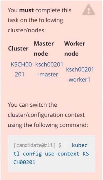 Cluster: dev Master node: master1 Worker node: worker1 You can switch the cluster/configuration context using the following command: [desk@cli] $ kubectl config use-context dev Task: