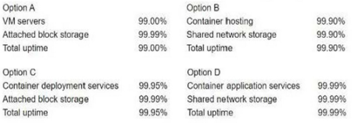 A cloud architect is reviewing four deployment options for a new application that will be hosted by a public cloud provider. The application must meet an SLA that allows for no more than five hours of downtime annually. The cloud architect is reviewing the SLAs for the services each option will use: