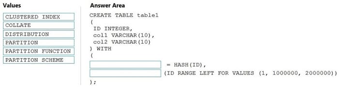 How should you complete the Transact-SQL statement? To answer, drag the appropriate values to the correct targets. Each value may be used once, more than once, or not at all. You may need to drag the split bar between panes or scroll to