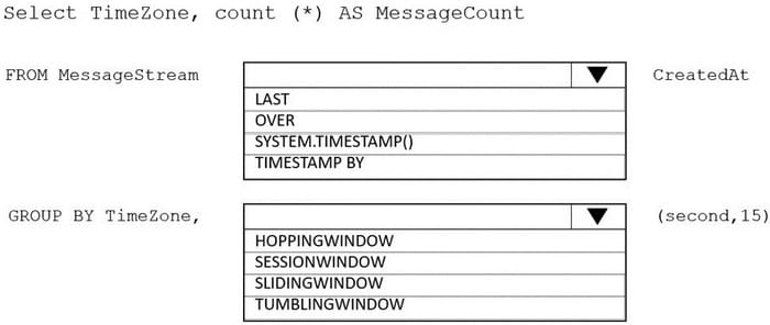 You need to ensure that the output from the Stream Analytics job counts the number of messages per time zone every 15 seconds.