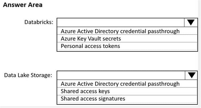 You need to recommend which authentication methods to use for Databricks and Data Lake Storage to provide the users with the appropriate access. The solution must minimize administrative effort and development effort.