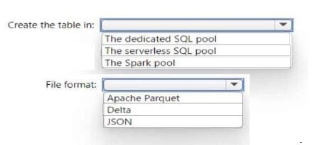 Where should you create the table, and Which file format should you use for data in the table? To answer, select the appropriate options in the answer area.