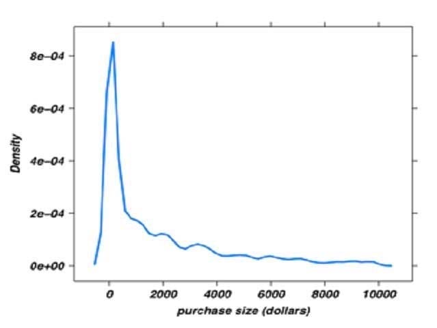 You have created a density plot of purchase amounts from a retail website as shown. What should you do