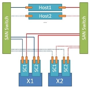 D. Multiple HBA connections per host Single initiator/single target per zone Maximum of 2 paths to each X-Brick for each initiator Each host connected to each SAN switch