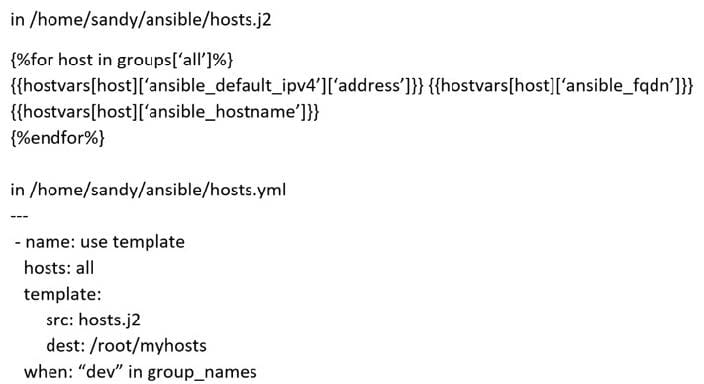 Create a jinja template in /home/sandy/ansible/ and name it hosts.j2. Edit this file so it looks like the one below. The order of the nodes doesn't matter. Then create a playbook in /home/sandy/ansible called hosts.yml and install the template on dev node at /root/myhosts