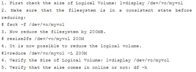 One Logical Volume is created named as myvol under vo volume group and is mounted. The Initial Size of that Logical Volume is 400MB. Make successfully that the size of Logical Volume 200MB without losing any data. The size of logical volume 200MB to 210MB will be acceptable.