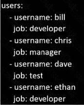 All users with the job of 'developer' should be created on the dev hosts, add them to the group devops, their password should be set using the pw_dev variable. Likewise create users with the job of 'manager' on the proxy host and add the users to the group 'managers', their password should be set using the pw_mgr variable.