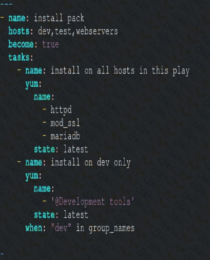 Create a file called packages.yml in /home/sandy/ansible to install somepackages for the following hosts. On dev, prod and webservers install packages httpd, mod_ssl, and mariadb. On dev only install the development tools package. Also, on dev host update all the packages to the latest.