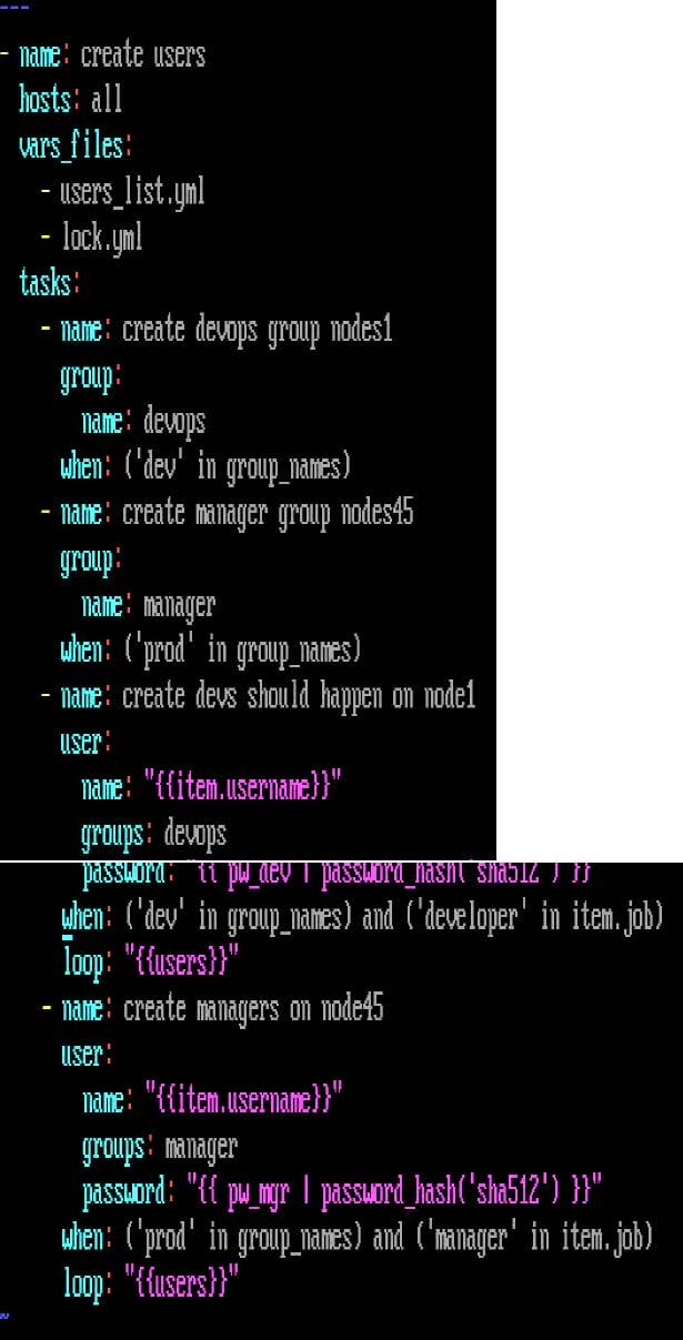 Create the users in the file usersjist.yml file provided. Do this in a playbook called users.yml located at /home/sandy/ansible. The passwords for these users should be set using the lock.yml file from TASK7. When running the playbook, the lock.yml file should be unlocked with secret.txt file from TASK 7.