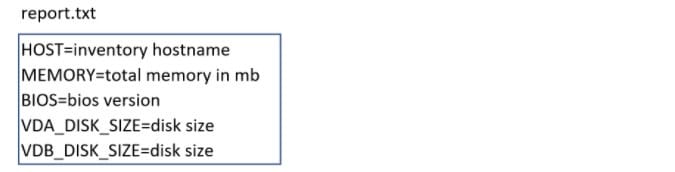 Create a file in/home/sandy/ansible/calledreport.yml.Using this playbook, get a filecalled report.txt(make it look exactly as below). Copy this file over to all remote hosts at /root/report.txt.Then edit the lines in the file to provide the real informationofthehosts. Ifa disk does not exist then write NONE.