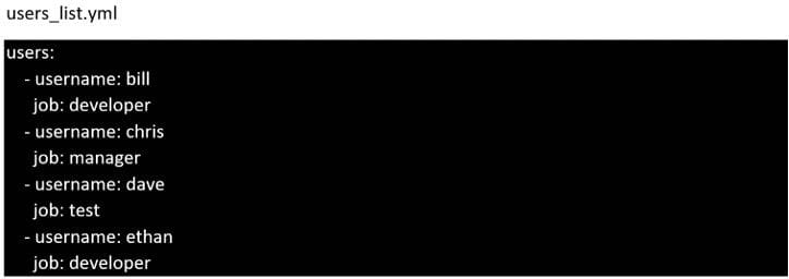 Create the users in the fileusersjist.ymlfile provided. Do this in a playbook called users.yml located at/home/sandy/ansible.The passwords for these users should be set using thelock.ymlfile from TASK7. When running the playbook, the lock.yml file should be unlocked withsecret.txtfile from TASK 7.