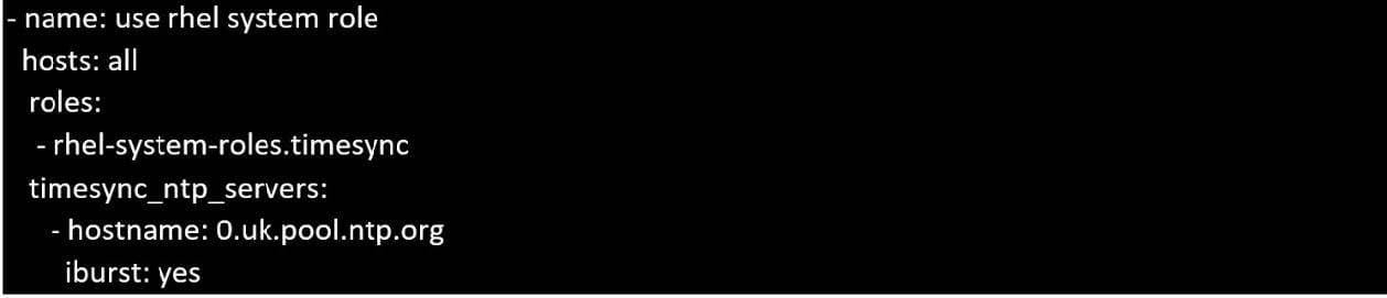 Create a playbook calledtimesvnc.yml in /home/sandy/ansible using rhel system role timesync. Set the time to use currently configured nip with the server 0.uk.pool.ntp.org. Enable burst. Do this on all hosts.