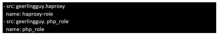 Create a file calledrequirements.ymlin/home/sandy/ansible/rolesto install two roles. The source for the first role is geerlingguy.haproxy and geerlingguy.php. Name the first haproxy-role and the second php-role. The roles should be installed in /home/sandy/ansible/roles.