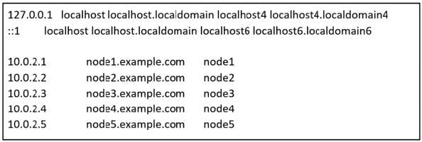 Create a jinja template in /home/sandy/ansible/ and name it hosts.j2. Edit this file so it looks like the one below. The order of the nodes doesn't matter. Then create a playbook in /home/sandy/ansiblecalledhosts.ymland install the template on dev node at /root/myhosts