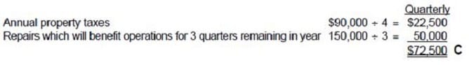 On March 15, 1992, Krol Co. paid property taxes of $90,000 on its office building for the calendar year 1992. On April 1, 1992, Krol paid $150,000 for unanticipated repairs to its office equipment. The repairs will benefit operations for the remainder of 1992. What is the total amount of these expenses that Krol should include in its quarterly income statement for the three months ended June 30, 1992?