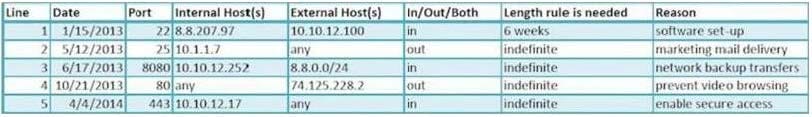 Dragonfly Industries requires firewall rules to go through a change management system before they are configured. Review the change management log. Which of the following lines in your firewall ruleset has expired and should be removed from the configuration?