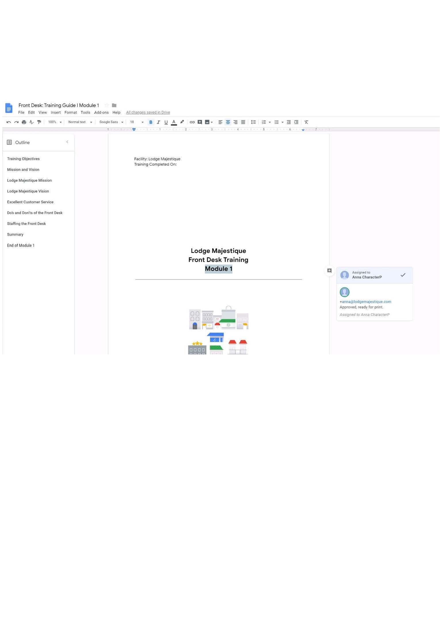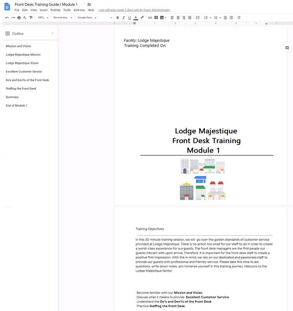 prominent vacation destination known for its great customer service. You will be finalizing a training guide for the Lodge Majestique Front Desk. Use the Front Desk: Training Guide | Module 1 for all the tasks in this scenario.