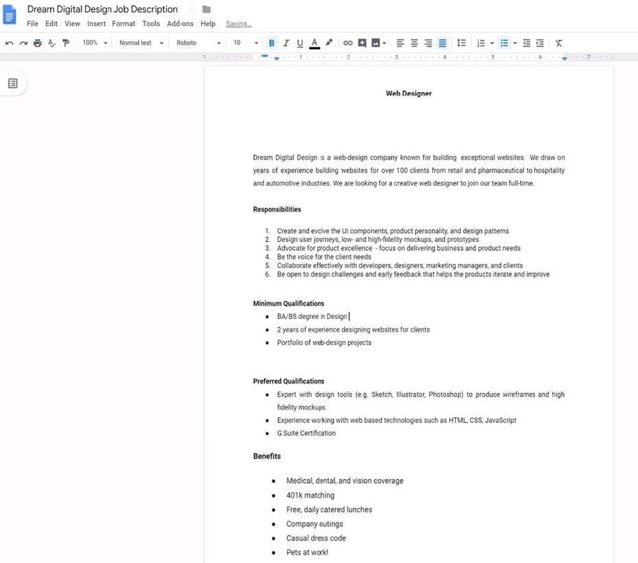 In the following tasks, you will demonstrate your ability to work in Google Docs. Dream Digital Design is a web design company known for building exceptional websites. You will be editing the job description for the new web designer role that will open shortly. Use the Dream Digital Design Job Description for all the tasks in this scenario.