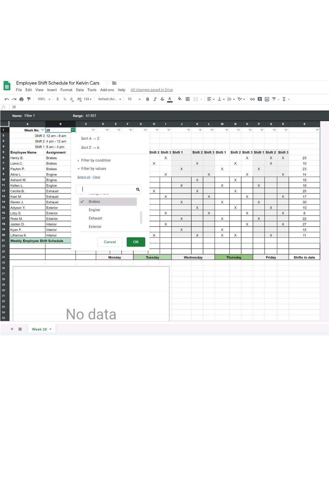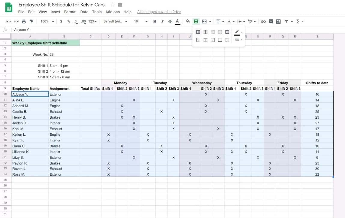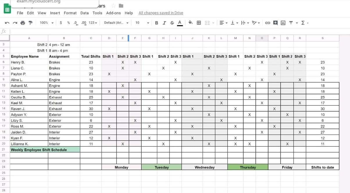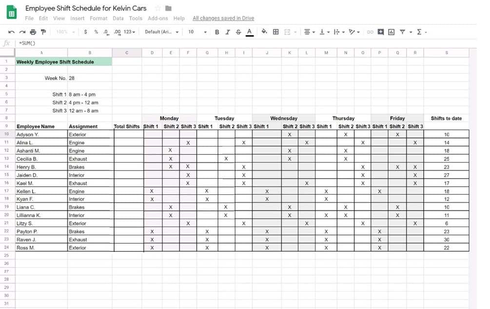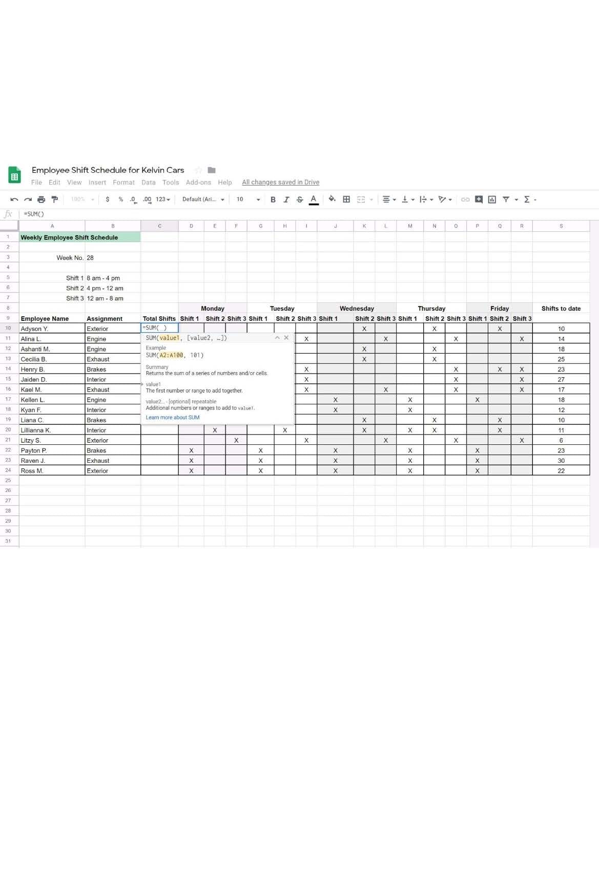 In the following tasks, you will demonstrate your ability to work in Google Sheets. You are organizing and analyzing the schedule of employee shifts. Use the Employee Shift Schedule for Kelvin Cars sheet for all the tasks in this scenario.