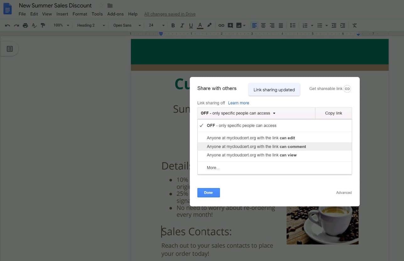 D. From Google Docs, add the customer as a collaborator to the summer discount flyer document