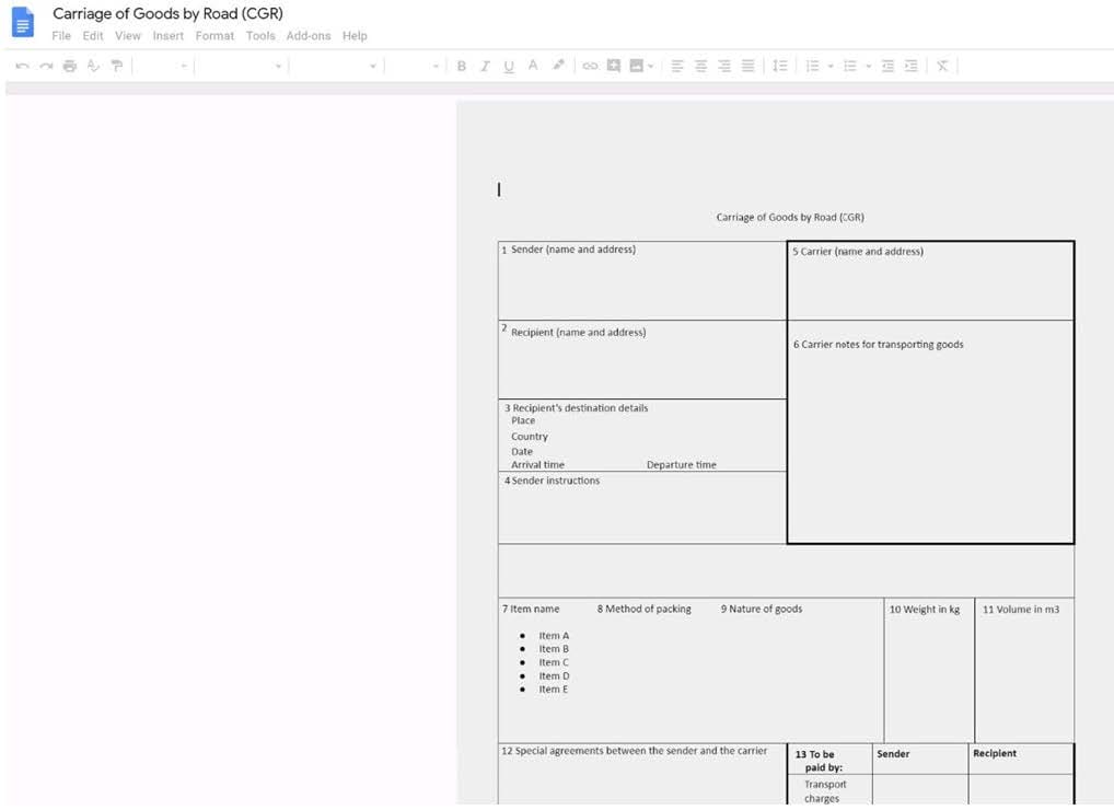 In the following tasks, you will demonstrate your ability to work in Google Docs. Cascara is a furniture wholesaler with warehouses located in Europe. You will be filling out a form to ship a load of goods to one of the warehouses. Use the Carriage of Goods by Road (CGR) for all the tasks in this scenario.
