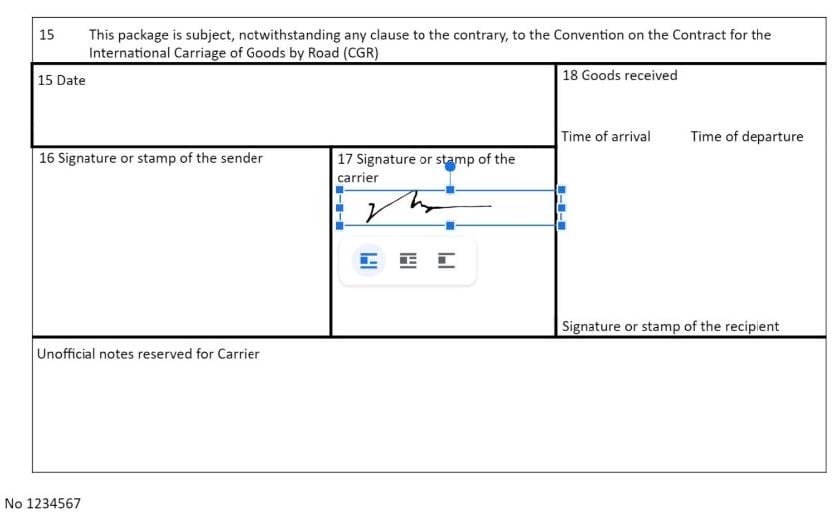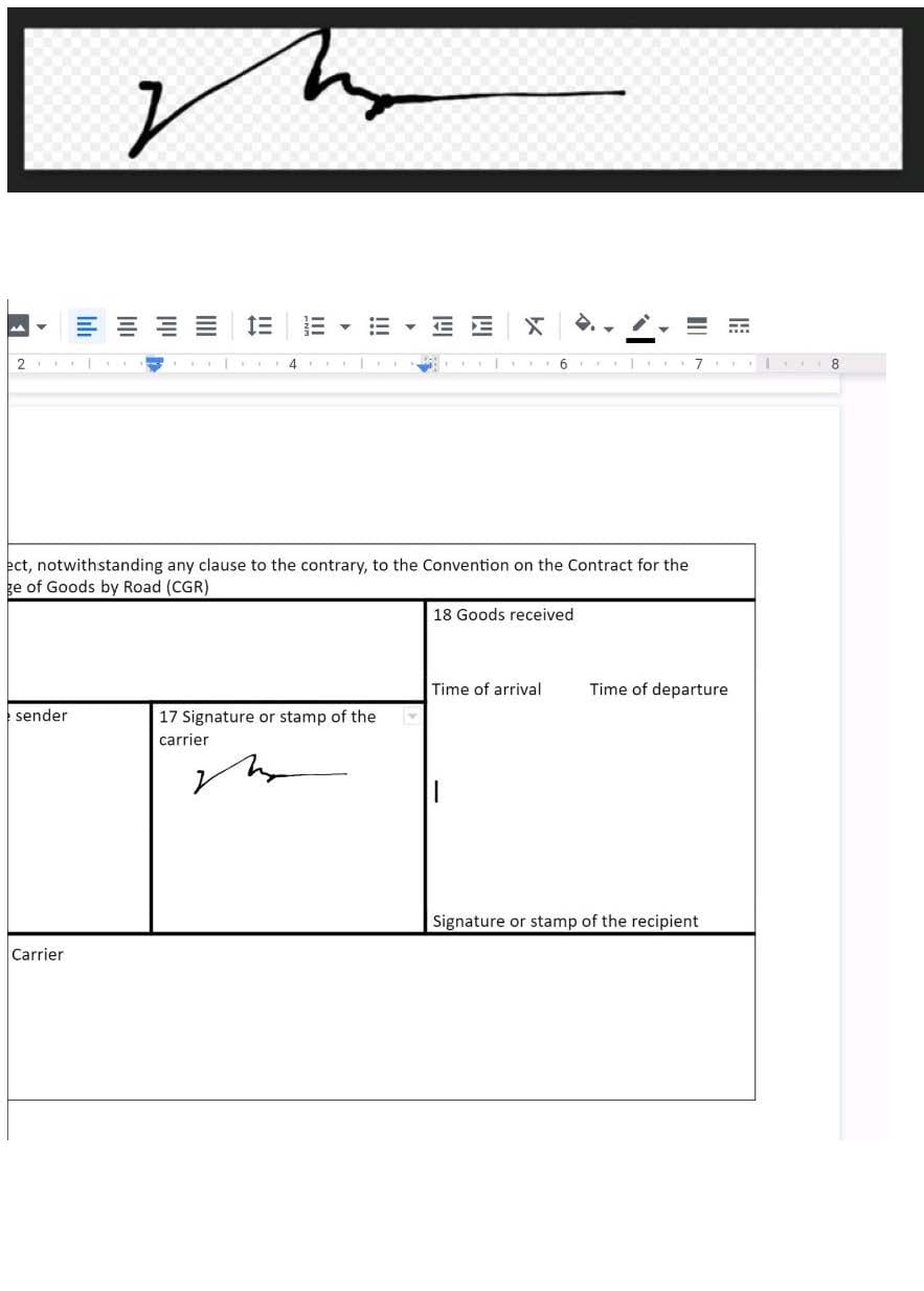 Insert the electronic signature, carrier_signature.png, in the cell titled, 17 Signature or stamp of the carrier.