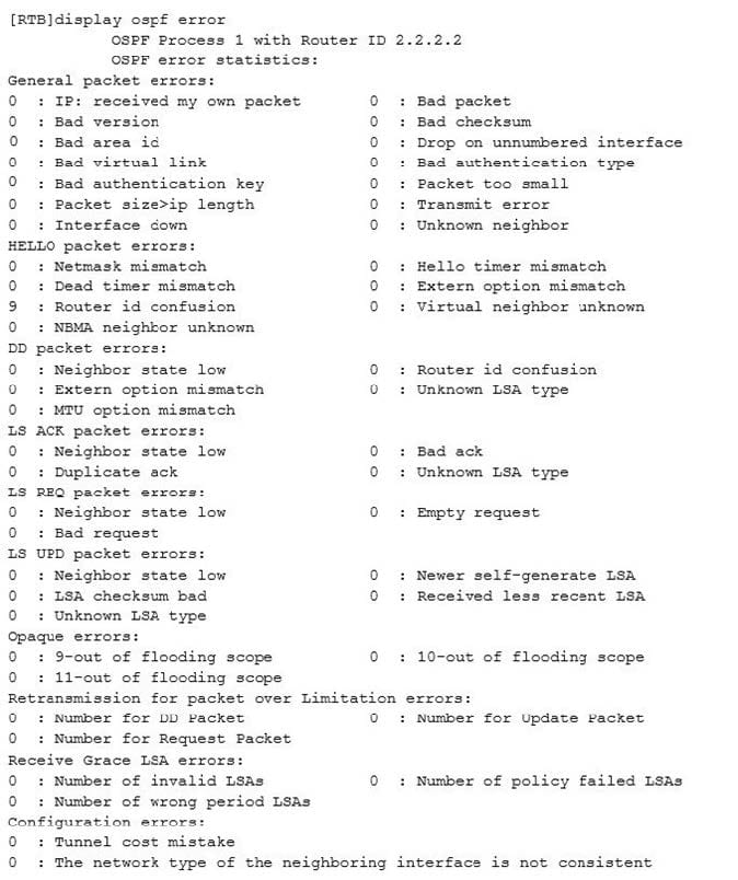 An OSPF neighbor relationship fails to establish and the OSPF error information is displayed as follows. Which of the following is most likely the cause?