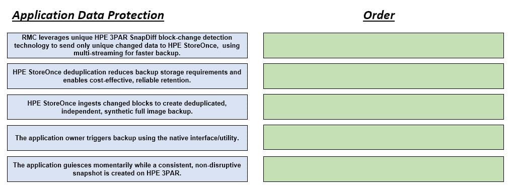 Arrange the process of HPE RMC-3PAR application data protection in the right order.
