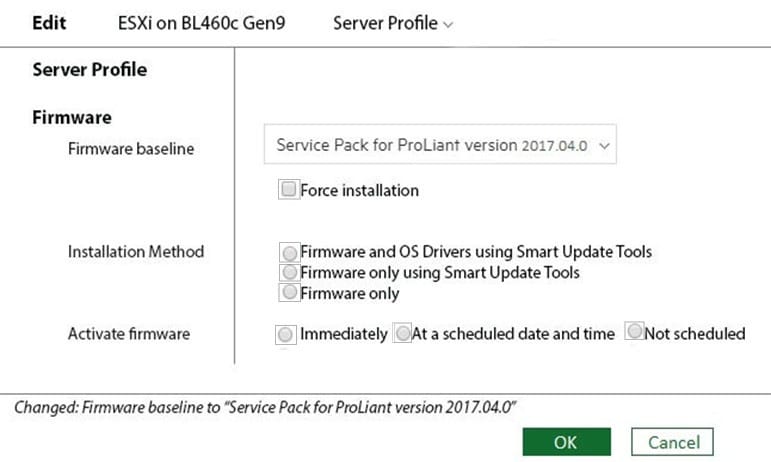 A customer has a four node ESXi cluster. They update drivers via vCenter Update Manager and want use HPE OneView Server Profile Templates to update the firmware while the systems are online. Click on the place they should select within the server profile template to update the firmware while the systems are online.