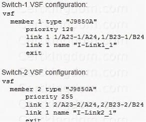 Switch-1 and Switch-2 have the Virtual Switching Framework (VSF) settings shown in the exhibits. The administrator then connects the switches together on the interfaces in the VSF link. The administrator first enables VSF on Switch-I and confirms the reboot. After Switch-1 reboots, the administrator enables VSF on Switch-2 and confirms the reboot. What happens?