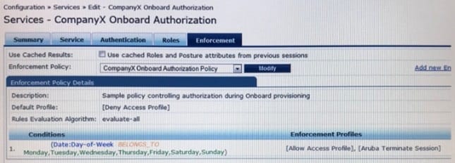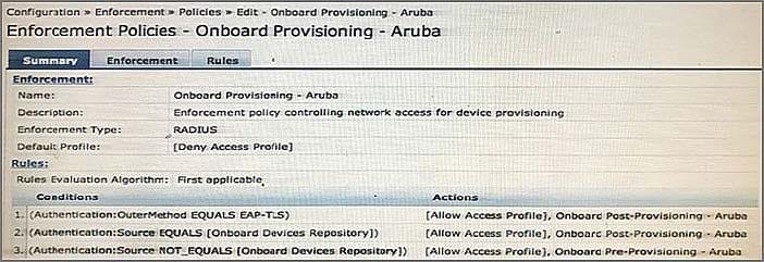 An employee connects a corporate laptop to the network and authenticates for the first time using EAP-TLS. Based on the Enforcement Policy configuration shown, which Enforcement Profile will be sent?