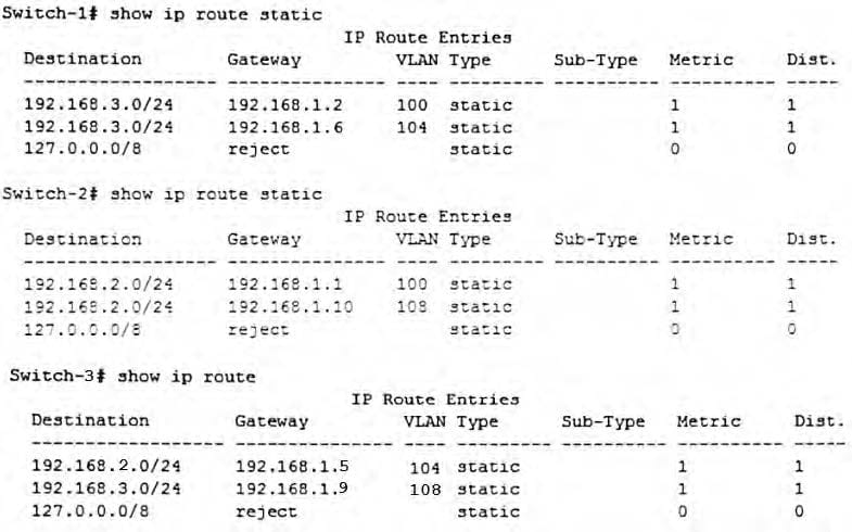 E. On Switch-1, add a route to 192.168.1.8/30 through 192.168.1.2; on Switch-2, add a route to 192.168.1.4/30 through 192.168.1.1; on Switch-3, add a route to 192.168.1.0/30 through 192.168.1.4.