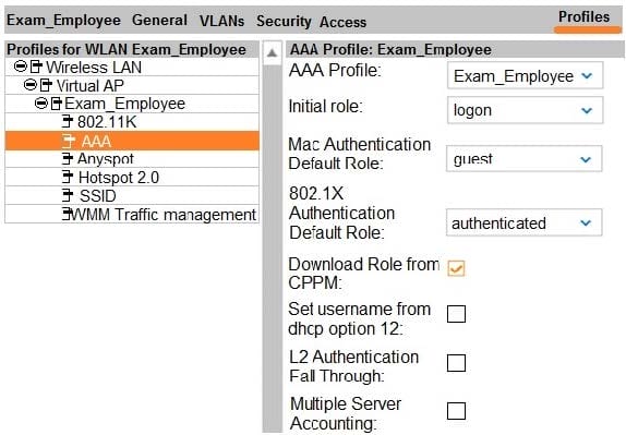 The exhibit shows the AAA profile for a WLAN on an Aruba solution. This WLAN uses 802.1X to