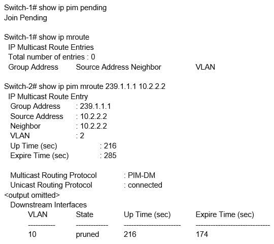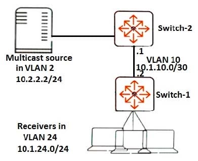 Exhibit 2 A network administrator sets up PIM-DM to route traffic from the multicast source to clients in VLAN 24. The server begins to forward multicasts, and the clients are set up to receive them. However, the multicasts do not reach the clients.