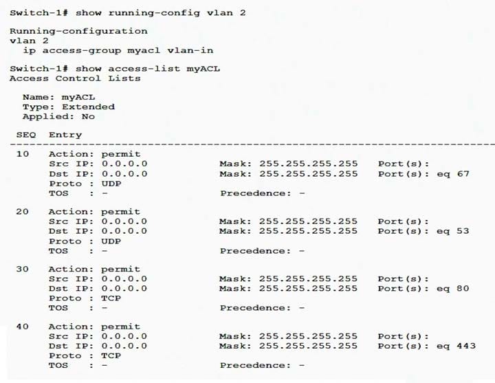 Endpoints in VLAN 2 connect directly to this switch. These devices should only be able to send DHCP, DNS, HTTP, and HTTPS traffic. However, they are able to send any traffic. Based on the exhibit, what is the issue?