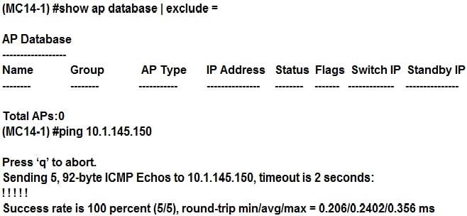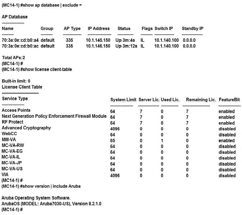 The network engineer waits for 20 minutes after connecting the APs and sees that no SSIDs are advertised. The network engineer logs into one of the MCs and one of the AP's consoles to obtain the outputs shown in the exhibits.