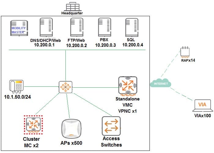 A network engineer deploys a Master Controller (MC) cluster at Headquarter to offer high levels of redundancy, and prepares the wired side of the network. This preparation includes the VLAN, DHCP Settings, and unicast routing services that APs require to reach the cluster.