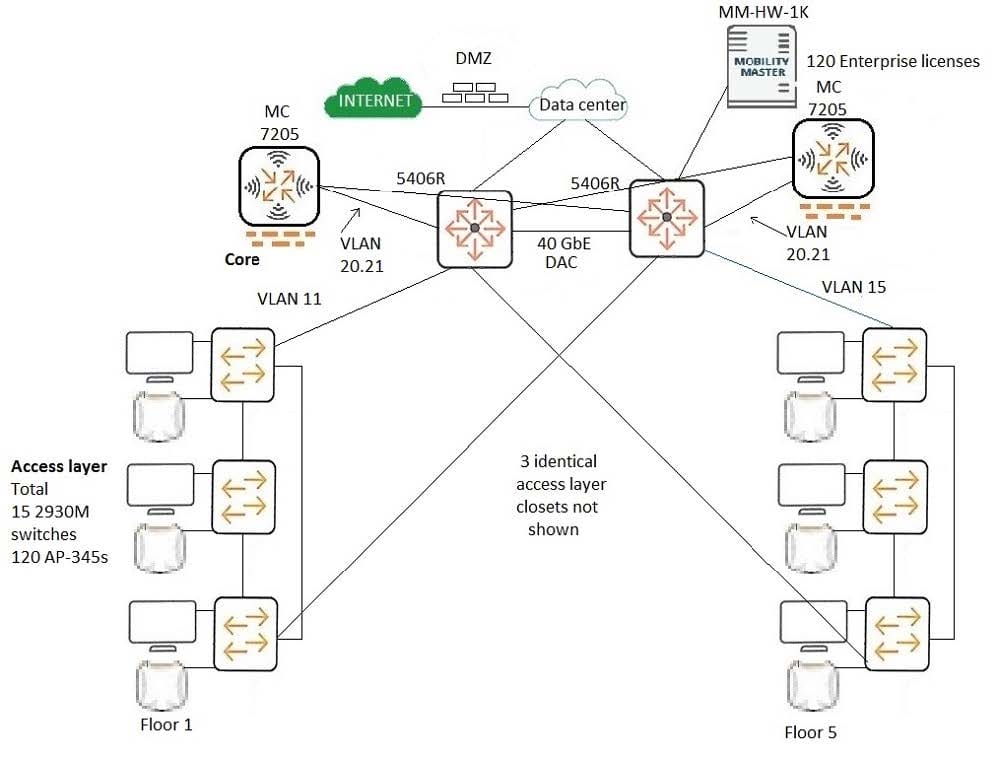 A customer has these availability requirements: loss of one controller with stateful failover and without impact on wireless client connectivity loss of one core switch without loss of connectivity for any endpoints or APs in the building loss of any one switch-to-switch or MC-to-switch link without loss of connectivity for any endpoints or APs in the building and with minimal impact on infrastructure functionality loss of any one access switch with minimal impact to wireless client connectivity